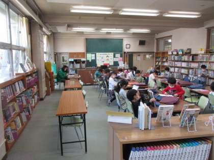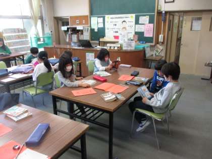 2組の授業は、図書です。子どもたちは、読書通帳を持って、図書室へ移動です。図書室で読んだ本のページ数を読書通帳に記入していきます。