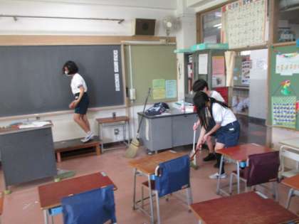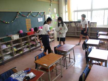 掃除の時間、1年生の教室をのぞいてみると、6年生が掃除をしてくれていました。1年生は、給食を食べたあと、すぐに下校です。6年生は、1年生の給食が始まる前から1年生の教室を掃除してくれていました。だから、1年生の教室は、いつもきれいだったのですね。