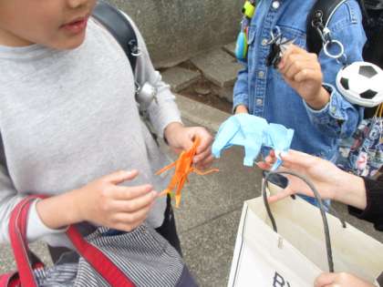 家で作ってきた折り紙の作品を見せてくれる人がいました。1枚の折り紙で作った作品です。どう見ても、1枚で作ったとは思えません。すごい才能です。持ってきた手提げには、たくさんの折り紙作品がつまっていました。周りの人も感心していました。