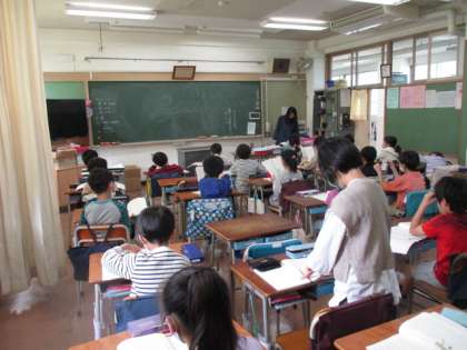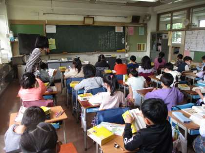 1組の授業は国語でした。単元は「きつつきの商売」です。文章の中で意味の分からない言葉や表現を動作を交えて、イメージ化しています。文章から、イメージを膨らませるのは、とても大切です。