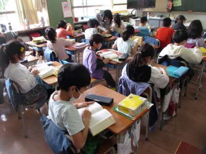 2組も国語をしていました。国語辞典の使い方の学習です。辞典をひいた場合、「じゆう」「じゅう」では、どちらが早く出てくるかなど、ひき方の約束を確認しています。私も自信がないようなものもありました。なかなか難しいですね。