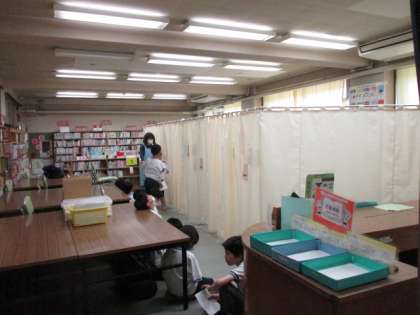 図書室にカーテンで仕切り、小部屋を作っています。いつもの図書室とは、だいぶ様子が違います。検診を待つ子どもたちは、図書室やその前の廊下で静かにしていました。