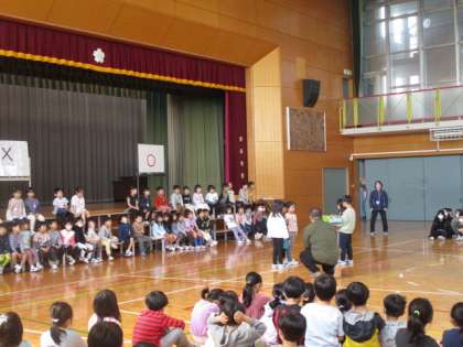 ○×クイズのあとは、2年生から1年生へのプレゼントの贈呈です。2年生からは、折り紙がおくられました。