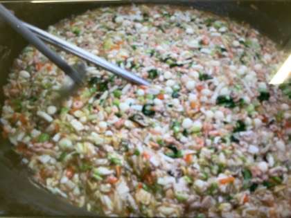 中華丼には8種類の野菜とえび・いか・豚肉・うずらの卵が入っています。