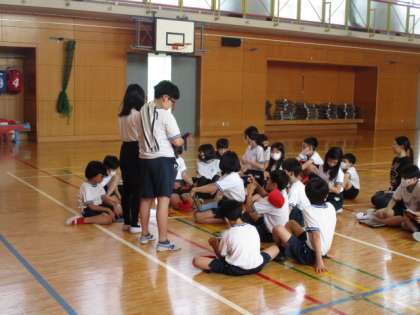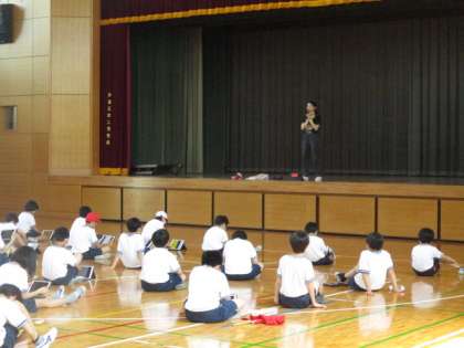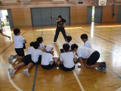 6年生は5時間目、学年で体育館集まっていました。運動会で行う6年生と5年生で行う演技についての打合せをしています。