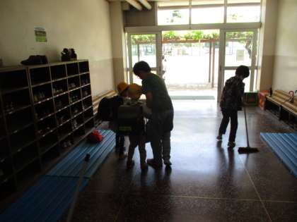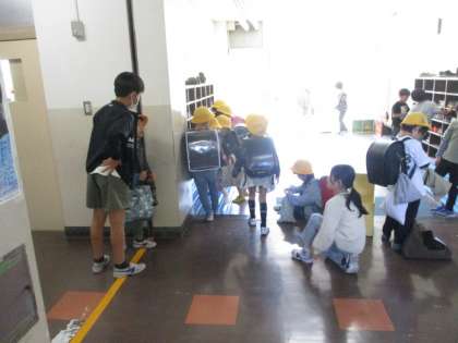 1年生のワゴンを運んでいる6年生がいました。自主的に手伝いをしているようです。写真におさめることはできなかったのが残念ですが、とてもすてきな光景です。また、昇降口では、くつをはき替える1年生の世話を6年生がしている姿もありました。
