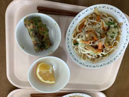 今日の給食は冷やしうどんです。なぜか給食で冷やしうどんを提供すると気温が下がり、残念なのですが、とてもよく食べていました。
