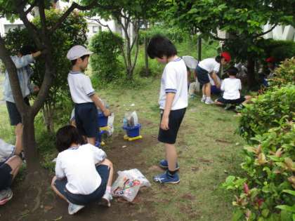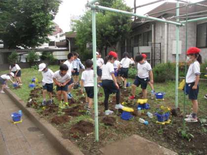 2組では、ヒヤシンスの種植えをしていました。今までの土を畑にもどし、新しい土を入れ、種を植えます。突然の雨に、子どもたちは木の陰で作業をしました。雨がひどくなる前に何とか植え終えることができました。