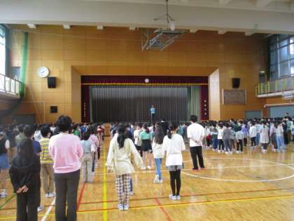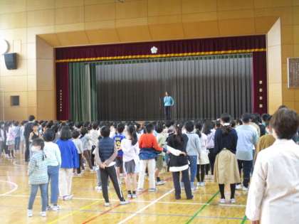 今日は雨のため、体育館での全校朝会です。ステージの上から話をしていると、子どもたちが話を真剣にそして、しっかりと聞いていることが伝わってきます。とても話の聞き方が上手な子どもたちです。