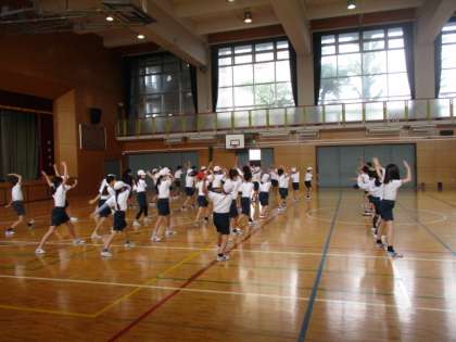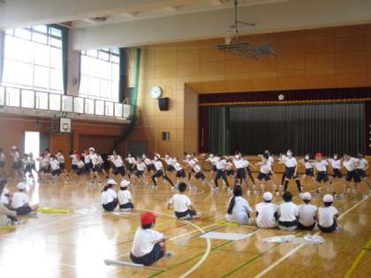 6年生と5年生は、体育館で運動会の演技の練習をしていました。校庭で行う予定でしたが、雨のため体育館に変更となりました。