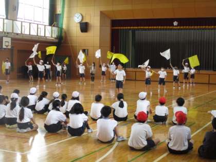 「ソーラン節」「フラッグ」「ダンス」の3グループで今までの練習の成果の見合いを行いました。気付いたよいところなどを伝え合っていました。