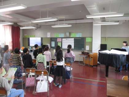 1組の授業は音楽です。「春の小川」を歌っています。ブレスの箇所に気を付けながら、楽しそうに歌っています。
