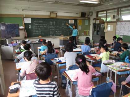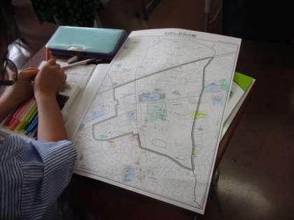 2組の授業は社会です。学校の周りの様子についての学習です。どのような施設が多いか、白地図に色で塗り分けています。いつも見ているものでも、どのような施設なのか分からないことって、結構あるのですよね。