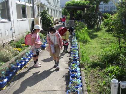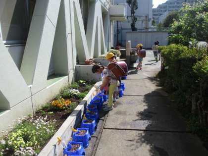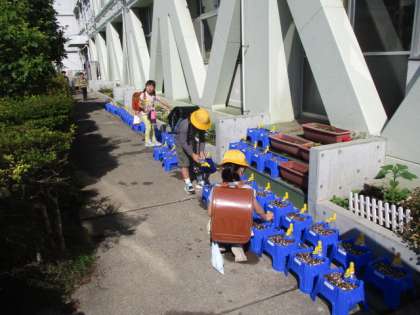 早く登校した子どもたちは、自分が育てているお花や野菜に水をあげています。ペットボトルに水を入れ、鉢にていねいに水を注ぐ姿がとてもすてきです。