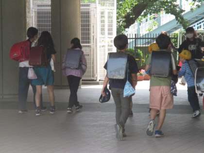 子どもたちが下校していきます。子どもたちを夏のような日差しが照り付けています。