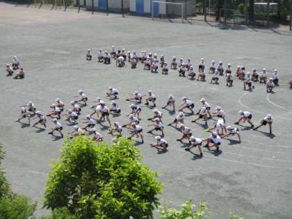 3階の教室からふと校庭を見下ろすと、校庭では、6年生と5年生が運動会の演技の練習をしていました。きれいに広がって演技の練習をしています。