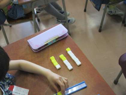 1組の授業は算数です。数の学習です。数をいくつといくつに分ける勉強です。一つの数をさくらんぼのように二つに分けます。それを考えるために、ブロックを実際に使って動かします。具体物を実際に操作することが大切です。
