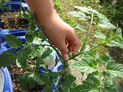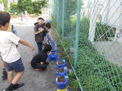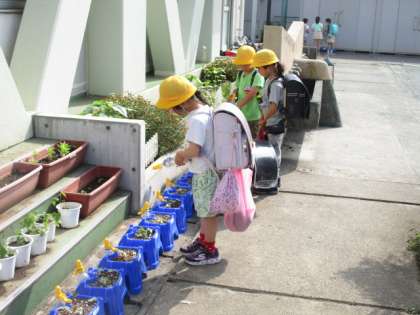 1年生はアサガオ、2年生はそれぞれの野菜、3年生はホウセンカを育てています。登校した人たちは、自分の鉢に水をあげています。アサガオもホウセンカもしっかりと芽が出てきました。ミニトマトに実がなっていると、教えてくれた人もいました。