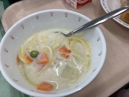 シナモントースト・パスタクリームスープ・キャベツとコーンのソテー・牛乳