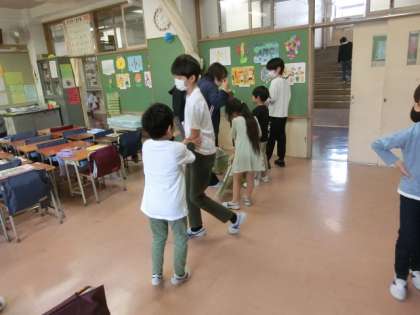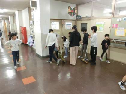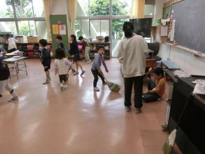 掃除の時間、1年生の教室をのぞいてみました。1年生が一生懸命に掃除をしています。そこには、6年生も手伝いに来ています。1年生は、机を運ぶ時、危ないので二人で運んでいます。