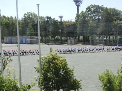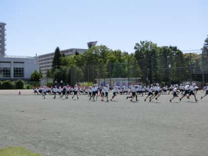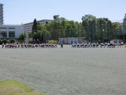 校庭では、6年生と5年生が団体競技の綱引きの練習をしていました。5年生が綱を引きあっているところに、6年生がトラックを走って、参戦します。