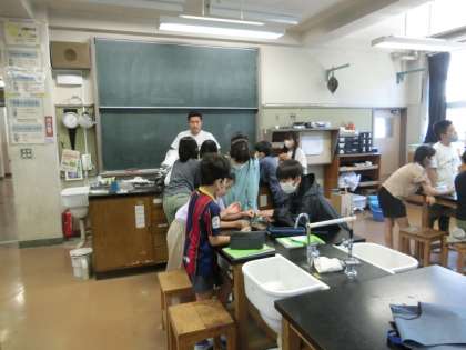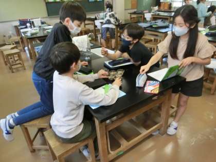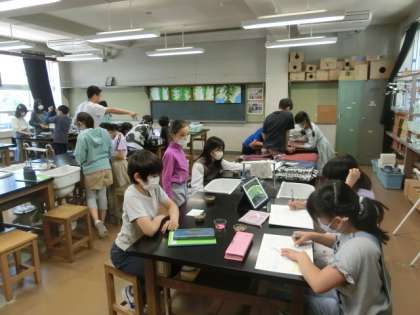 2組の授業は、理科です。植物の学習です。インゲンマメの種が発芽するには、何が必要かを調べます。各班にインゲンマメの種が配られています。土の代わりには、栄養のないバーミキュライトを使います。
