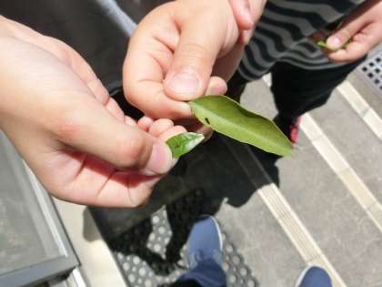 中休みの終わりに、子どもたち二人に声をかけられました。キンカンの葉で幼虫のようなものを見つけたというのです。よく見ると、アゲハチョウの幼虫に見えます。とても小さいです。よくこんなに小さい幼虫を見つけました。