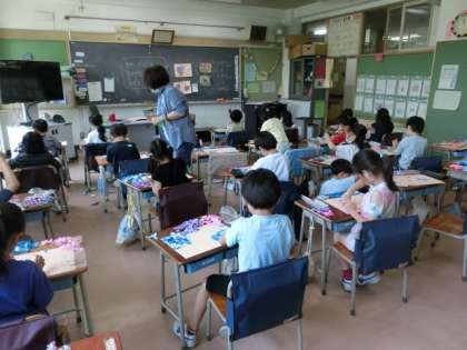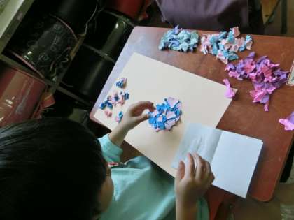 1組の授業は図工です。ちぎった紙を画用紙にはって、あじさいの花をつくっていきます。初めにくしゃくしゃにした紙をちぎり、それを画用紙にはっていきます。きれいなあじさいの花がどんどん咲き始めました。