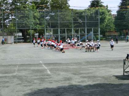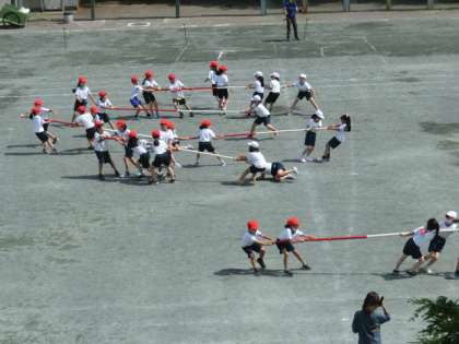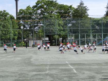 校庭では、3年生が競技の練習をしていました。3年生の競技は「棒引き」です。2、3人で棒を引き合っています。見ていても力が入ります。どの棒をねらうかなどの作戦も重要です。さあ、本番ではどちらが勝つのでしょうか。