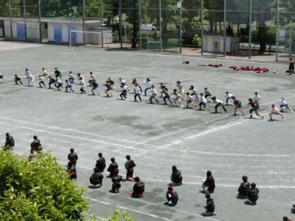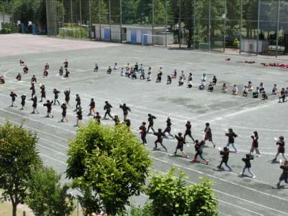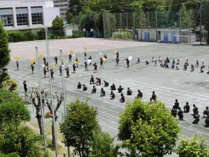 6年生と5年生は演技の練習です。衣装を身に付け、最後の確認をしました。3階から見ていると、子どもたちの動きがそろっていることがよく分かります。明日の本番、子どもたちの練習の成果を楽しみにしていてください。