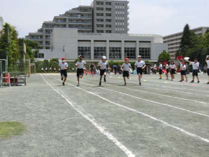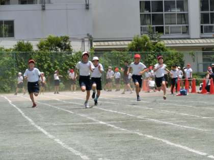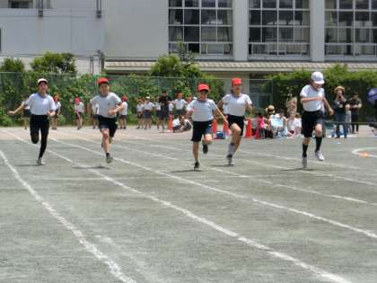6年生の100m走です。6年生になると走り方は、とても力強いです。見ていてものすごい迫力です。子どもたちの気迫が伝わってきます。