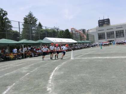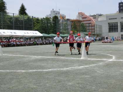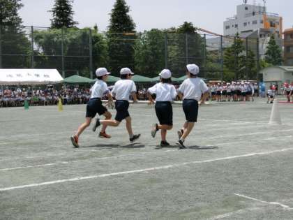 4年生の競技は池尻ハリケーンです。4人組で長い棒を持ってコーンをまわる折り返しリレーです。内側の人が中心となって小さく回り、外側の人は大回りをしなければなりません。作戦が大切になってくる競技です。子どもたちは、一生懸命に、そして楽しそうに競技をしていました。