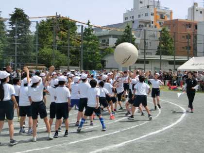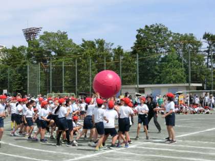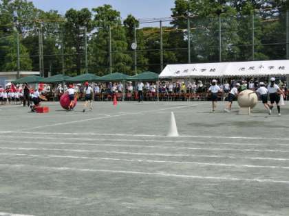 最後の得点種目、全校で行う大玉送りです。1年生2年生は転がる大玉を転がして送っていきます。3年生からは、大玉を頭上に持ち上げ、送っていきます。跳ねるように動く大玉に子どもたちの気持ちが表れています。