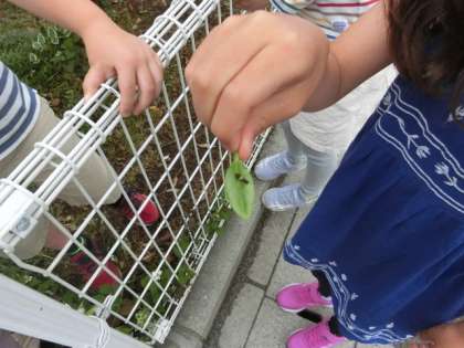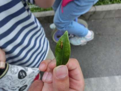 中休みのことです。職員室前のキンカンの木に何人かが集まっていました。キンカンの葉にたくさんのアゲハチョウの幼虫を見つけたようです。前から何度も見つけていましたが、今日は、特にたくさんの幼虫を発見しています。一つの葉に卵と幼虫がそれぞれついているものもありました。