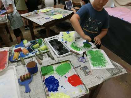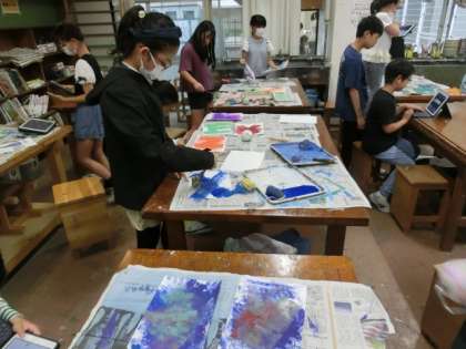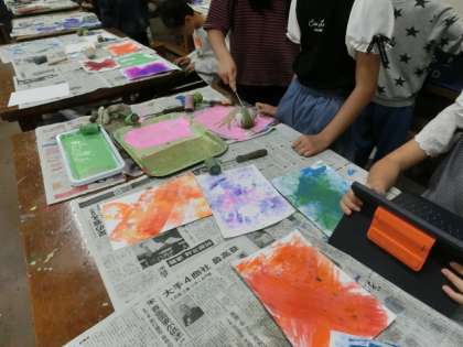 1組の授業は図工です。様々な形をしたローラーを使って、いろいろな模様をつくっています。転がし方や色の使い方によって、個性あるデザインが生まれています。