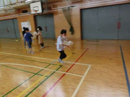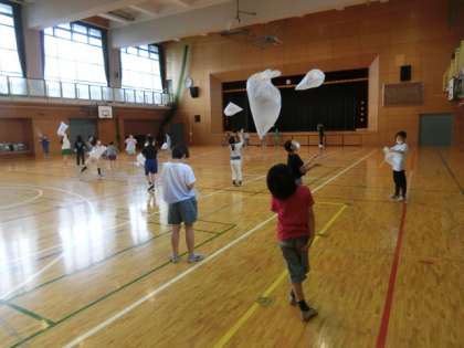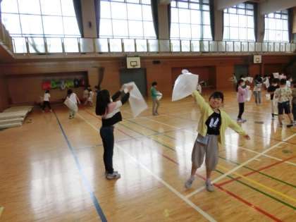 2組の授業は、理科です。空気の実験です。袋に空気をためるとどのようになるか調べています。膨らんだ袋を確認した後は、袋を使って遊んでいます。