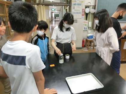 ろうそくに火をつける時は、マッチを使います。子どもたちはマッチを使ったことがないので、それにもドキドキしています。ろうそくが消え、集気びんの中の石灰水は白くなりました。集気びんの中の気体が変化をした証拠です。