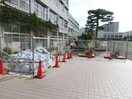 校舎の耐震工事のため、主事室から職員室前に工事が入っています。職員室前のいぬばしりが通行止めになっています。子どもたちは、登下校の際、校庭を通ることになります。今週は学校公開があります。保護者の皆さまも、ご注意ください。