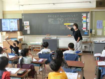 1年生の授業は算数です。たし算の文章題の学習です。文章のとおりにブロックを動かしていきます。実際の操作がとても重要です。