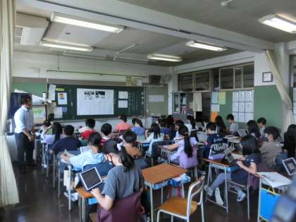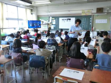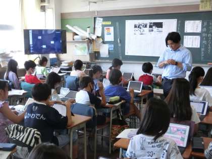 「アップ」と「ルーズ」の写真を生かした説明文を一人ひとり、好きなことを題材に書きます。子どもたちは、一生けん命に書き込んでいました。