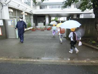 はじめは強く雨が降っていましたが、8時20分を過ぎると、雨がかなり弱くなってきました。かさをささずに登校する人も出てきました。
