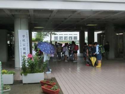 子どもたちが登校してきました。雨の朝です。早く登校していた人たちは、ピロティで雨宿りです。