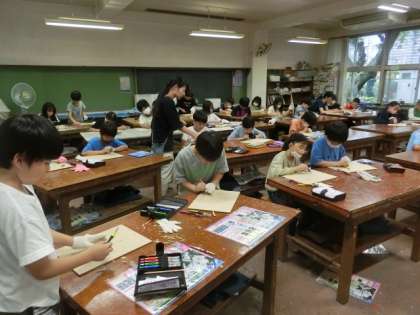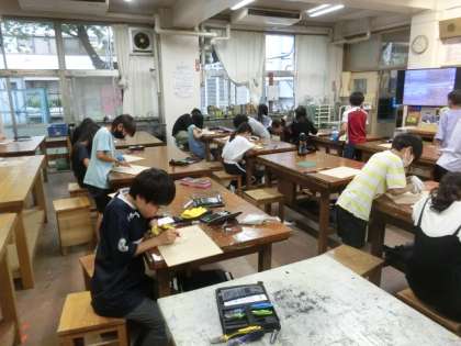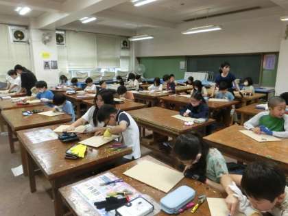 初めて彫刻刀を使います。彫刻刀の使い方の練習です。まっすぐな線や曲がった線を彫っていきます。力の入れ具合が難しく思ったように彫ることができません。簡単ではありません。