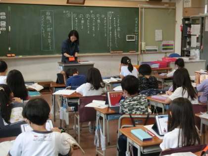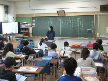 1組の授業は国語です。説明文の学習です。説明文の中にある「問い」に対しての答えはどこにあるのかを考え、タブレットに線を書き入れています。タブレットの使い方、いろいろありますね。