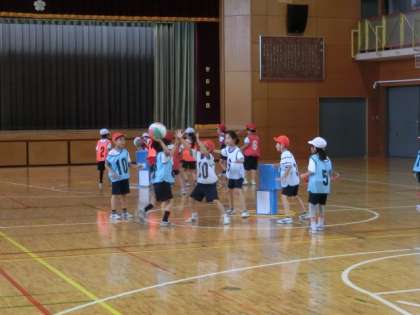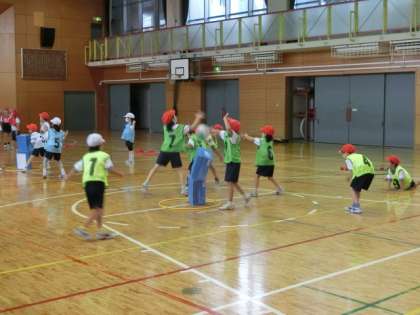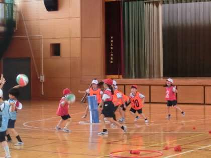 1組の授業は体育です。体育館でボール投げゲームをしていました。段ボールの的に向けて、ボールを投げます。相手チームはそれを妨害します。どのようにボールを回したら、的にぶつけやすくなるのでしょう。子どもたちは考えます。