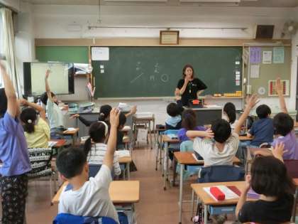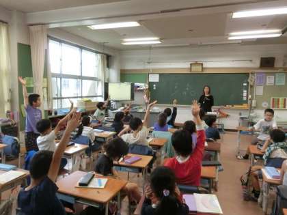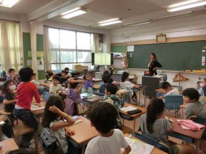 2組の授業は国語です。この間の続きの言葉の勉強です。表記が同じで複数意味のある言葉をクイズ形式で出し合っています。子どもたち一人ひとりが考えた問題です。とても盛り上がっています。