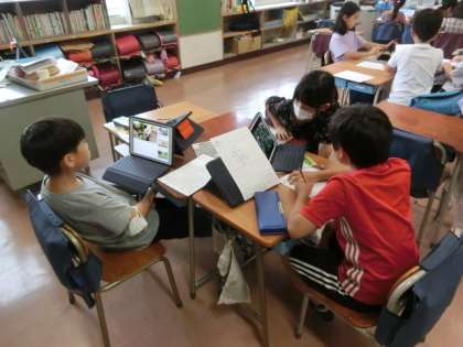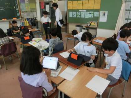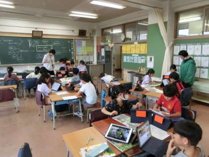 2組の授業は生活です。育てている野菜をどのようにしたらよく育つかを班で調べていました。調べるだけではなく、友達とも相談しています。友達と話をし合うことはとても大切です。