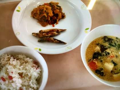 梅じゃこごはん・かきたま汁・きびなごの唐揚げ・切り干し大根の煮付け