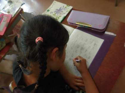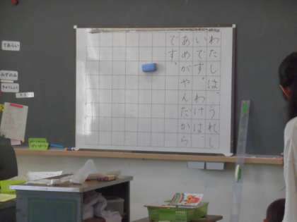 マス目に文字をおさめながら、作文を書きます。自分の気持ちも文で表現しています。