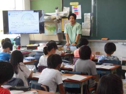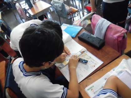 「角」の学習です。分度器を用いずに、計算して角度を求めています。友達と声を掛け合い、確かめたり教え合ったりしています。